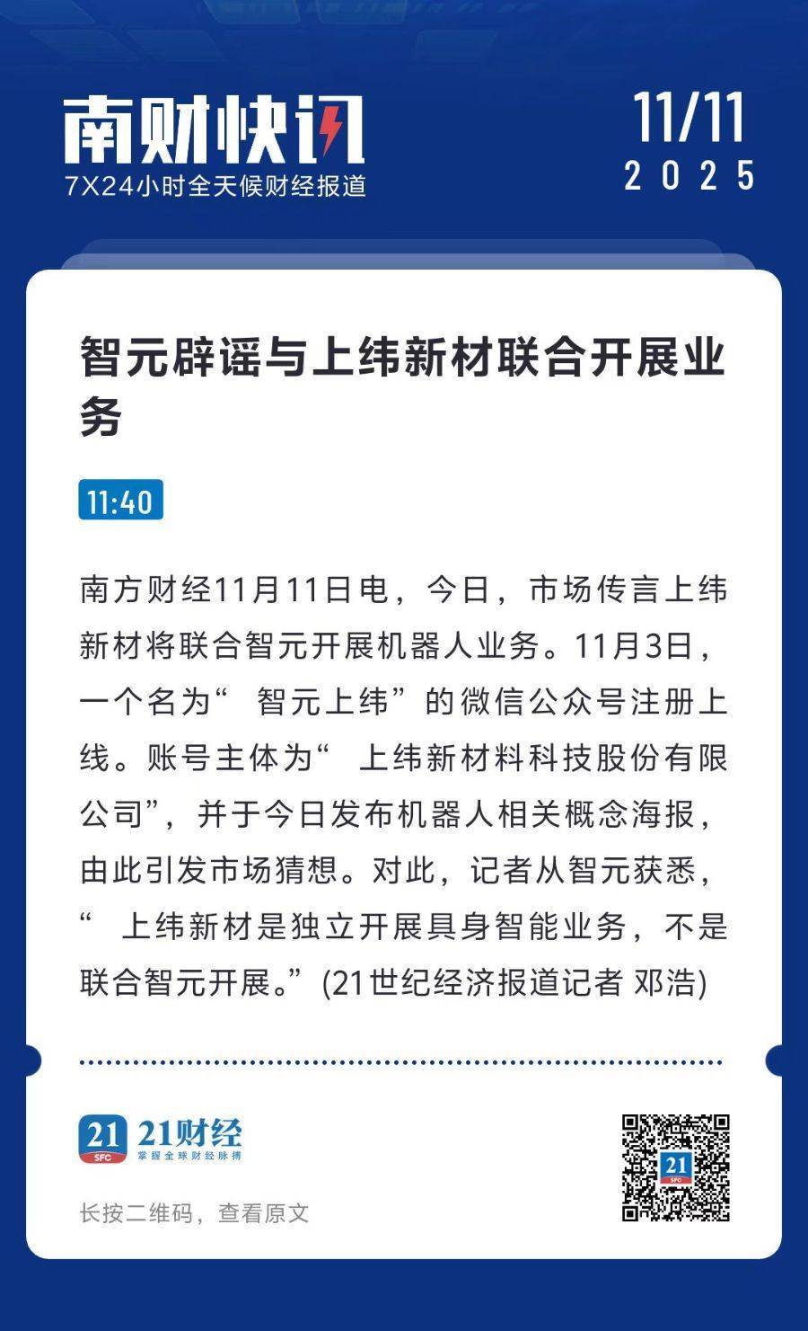 随后,有报道称上纬新材将联合智元机器人开展业务,引发市场对上纬新材未来业务发力空间的想象。21世纪经济报道记者从智元获悉,上纬新材是独立开展具身智能业务,并非联合智元开展。