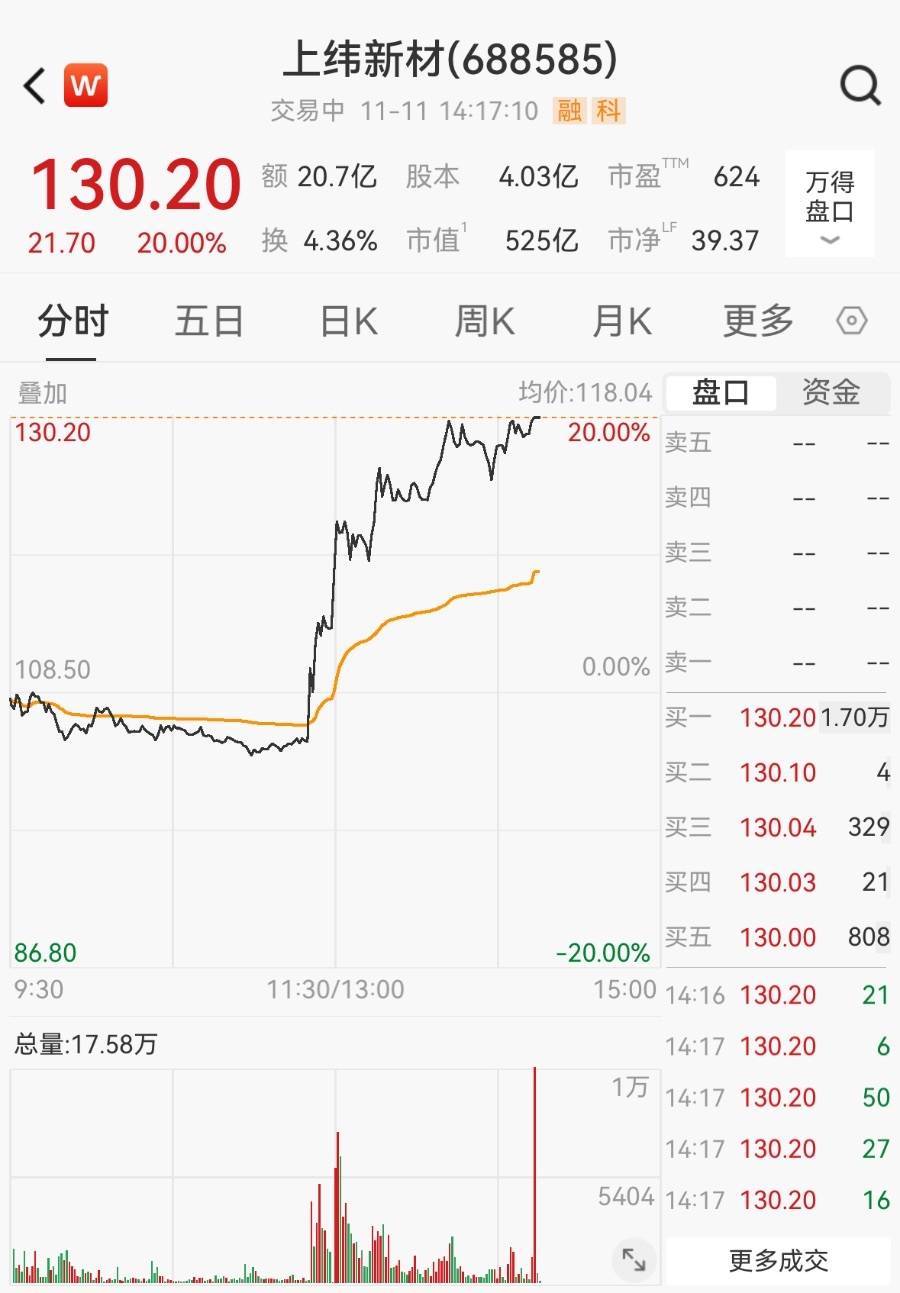 11月11日配资讨论网,上纬新材(688585.SH)盘中股价突然直线拉升,午后触及20cm涨停。