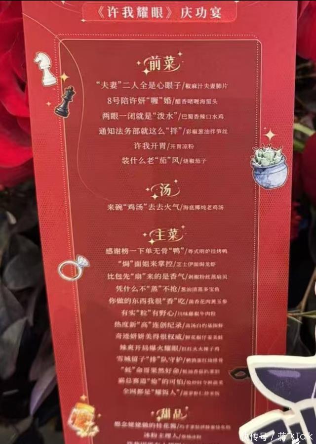 这场宴会除了演员以外,庆功宴菜单也特别有意思。 夫妻肺片改名“二人全是心眼子”,烧椒茄子叫“装什么老茄风”,连凉拌木耳都叫“别给我画饼”,全是剧里的梗。