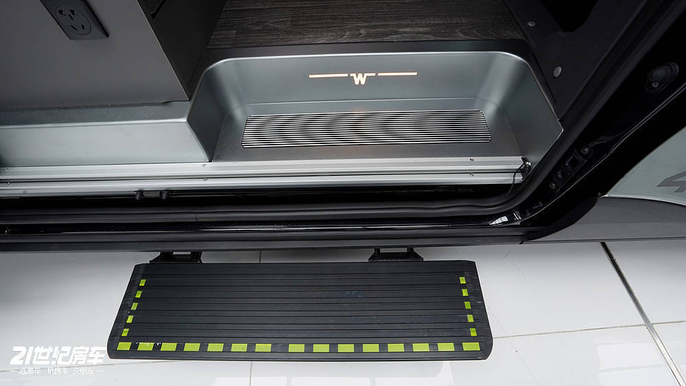 外观设计的实用细节处处可见。车身右侧配备原厂电动侧踏步,车门开启时自动伸出,老人小孩上下车更安全便捷。车顶可选装太阳能板与行李架,车尾能加装房车专用爬梯和后挂行李箱,从设计源头就为 长途越野旅居”做好了准备。